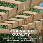 Sturdy, 5.5″ by 5.5″ posts with classic plinths support this Pergola while offering occupants underneath a clear, unobstructed view of the rest of your landscape. Elegantly shaped straight-line gussets support the decorative structure overhead. Its multilevel design with profiled beams and trellis ends creates an eye-catching design that wouldn’t be out of place in a Mediterranean resort or a villa in a tropical locale. While it’s beautiful, you could make it more distinctive and festive by planting creeping vines or flowering plants around it or decorating it with strings of party lights to create an enchanting effect at night.